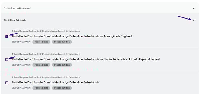 As certidões estão organizadas por categoria. Você pode expandir cada uma para visualizar e selecionar: