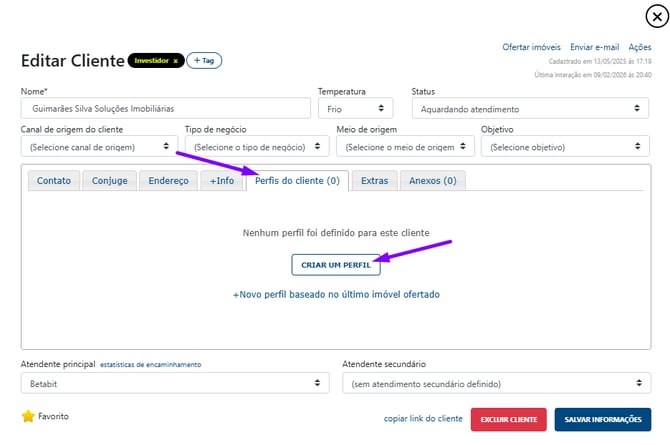 Dentro do cadastro, procure pela aba central chamada Perfis do cliente (0). Se o cliente ainda não possuir nenhum critério salvo, o sistema exibirá o botão Criar um perfil. Clique nele para abrir a tela de configurações.