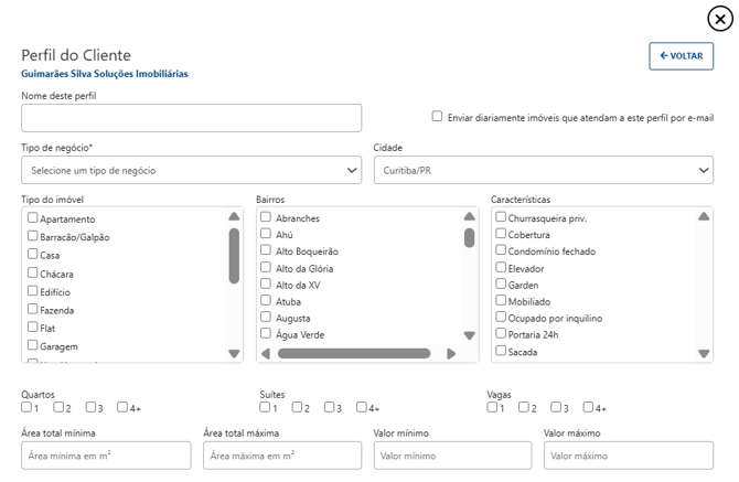 Nesta tela, você deve definir os filtros que representam o "imóvel dos sonhos" do seu cliente: