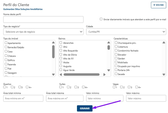 Nome do perfil: Dê um nome para identificar a busca (Ex: "Apartamento 3 quartos no Centro").