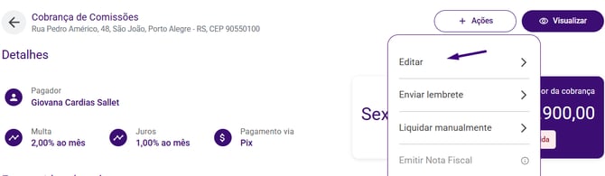 Ao selecionar Editar, você verá uma tela com os dados da cobrança.