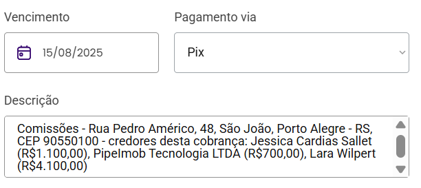 Em cobranças de comissão, o sistema ajusta automaticamente os favorecidos de forma proporcional, mantendo as porcentagens originais.