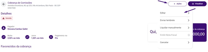 - Encontre a cobrança desejada, clique em Ações e depois em Editar.