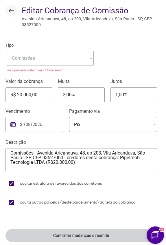 Saiba como alterar informações em cobranças já emitidas no PipeImob, com segurança e controle de permissões.