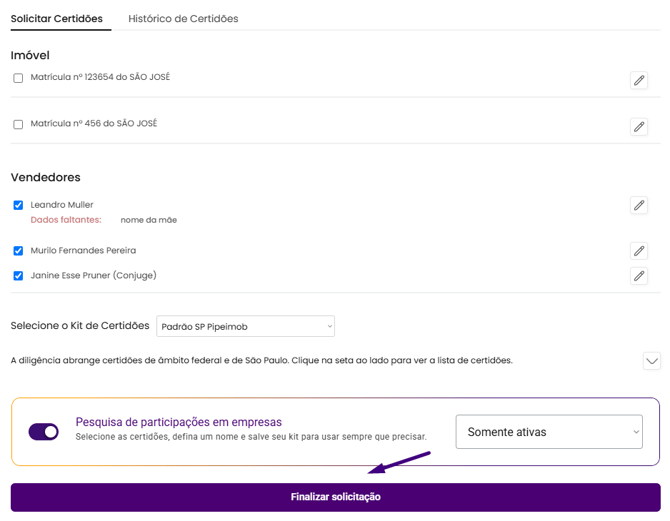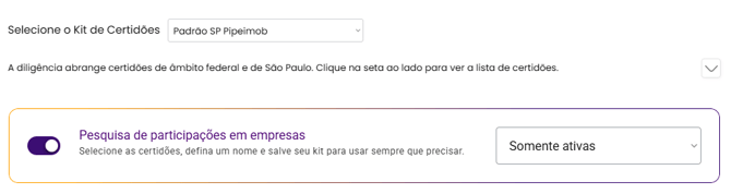 Após selecionar o Kit de Certidões, o sistema já exibe automaticamente a configuração da pesquisa de participações societárias, conforme foi definida na criação do kit.
