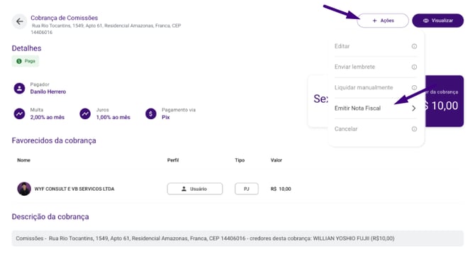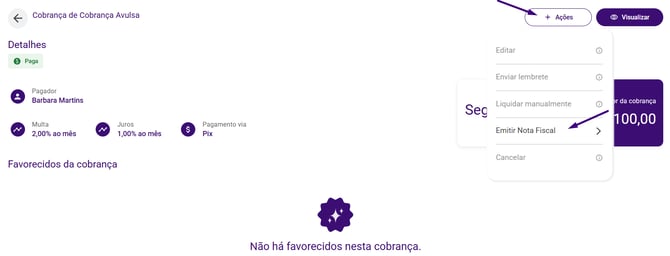 Clique na cobrança correspondente e selecione +Ações > Emitir Nota Fiscal.