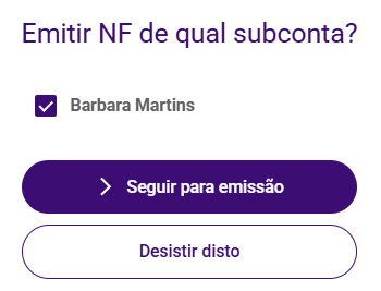 Após clicar em Emitir Nota Fiscal, o sistema exibirá a tela de seleção da subconta emissora.