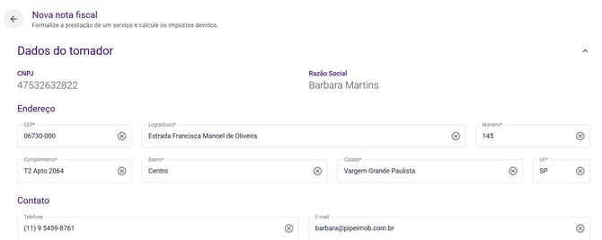 Na próxima tela, verifique os dados do tomador do serviço, como CNPJ, endereço, e-mail e telefone.