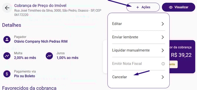 Opção 2: Cancelar cobrança pela tela de Cobranças