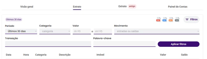 Ao visualizar o extrato, você pode exportar os dados em diferentes formatos, de acordo com sua necessidade: