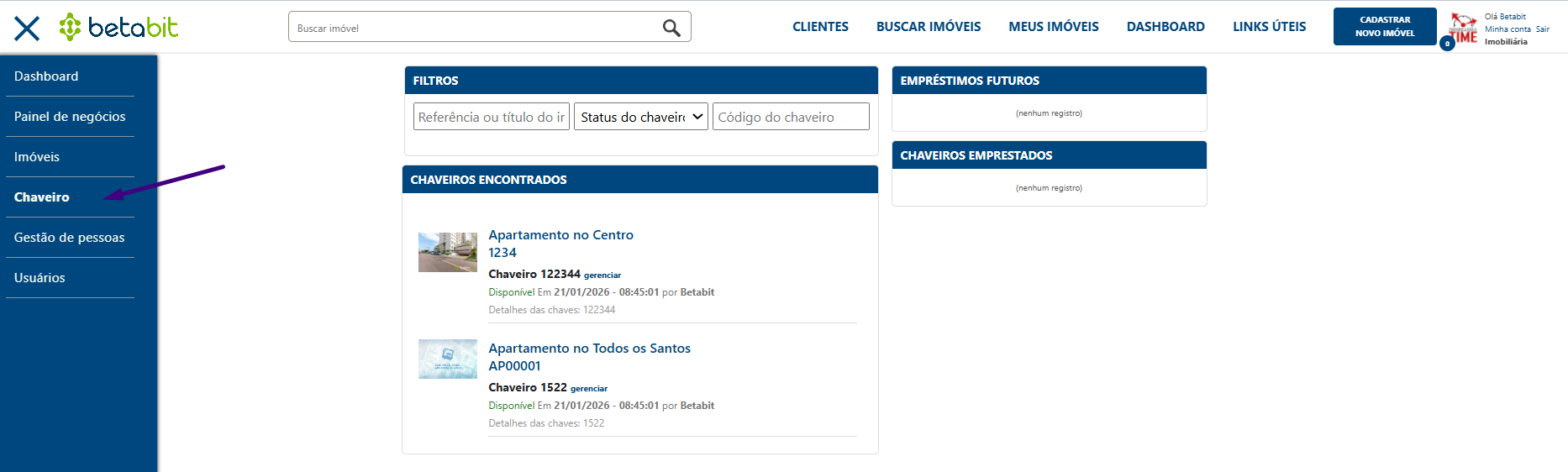 Após cadastrar o número, o imóvel passa a ser gerenciável no menu lateral Chaveiro.