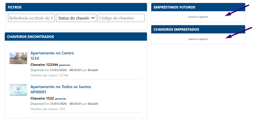 Empréstimos Futuros: Reservas e agendamentos de chaves para os próximos horários.