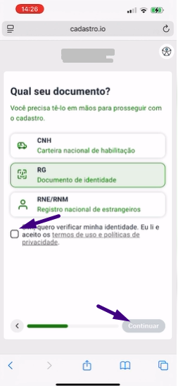 Em seguida, marque a caixa confirmando que autoriza a verificação da sua identidade e aceite os termos de uso e políticas de privacidade.