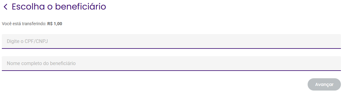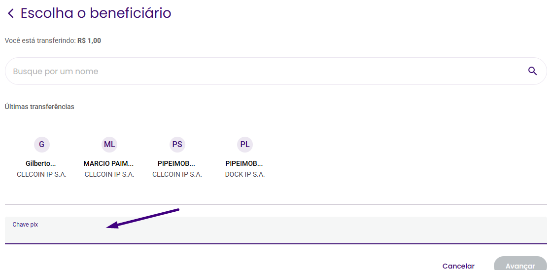 Preencha a chave Pix do destinatário no campo indicado e clique em Avançar: