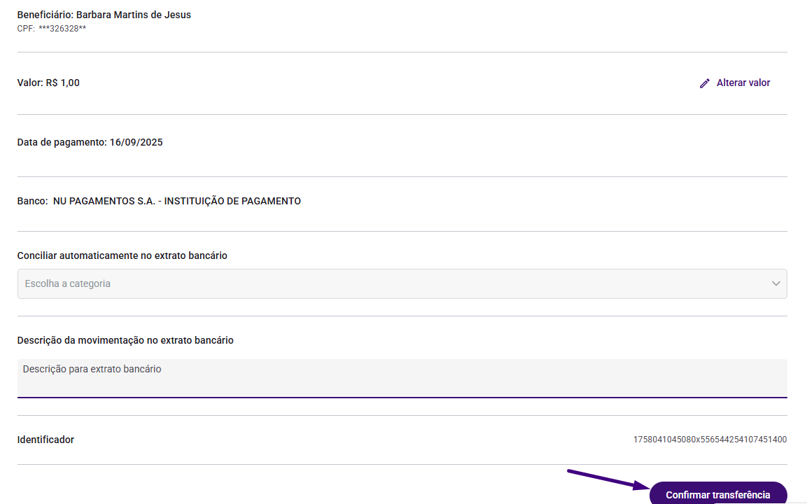 Verifique os dados da transferência. Se estiver tudo correto, clique em Confirmar Transferência: