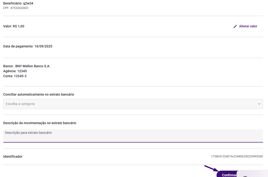 Complete as informações do beneficiário, como Agência, Conta, CPF/CNPJ e Nome.