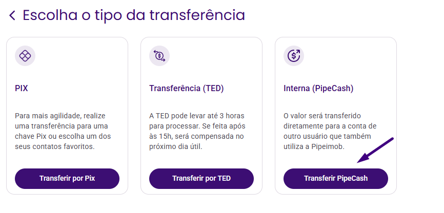 - Selecione a opção de Transferência Interna PipeCash: