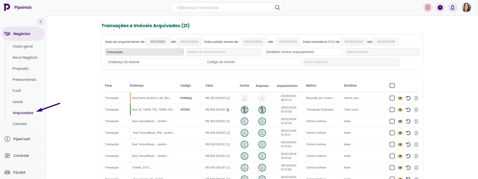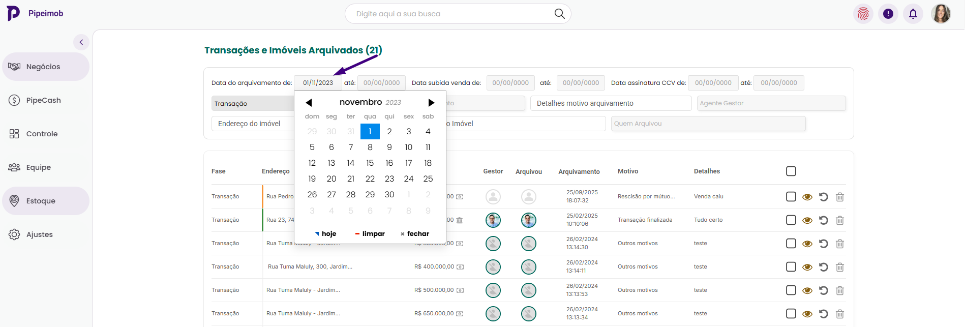 - Data de Arquivamento: Por padrão, o sistema filtra pelos últimos 30 dias. Se o imóvel foi arquivado antes desse período, será necessário ajustar o filtro para encontrá-lo.
