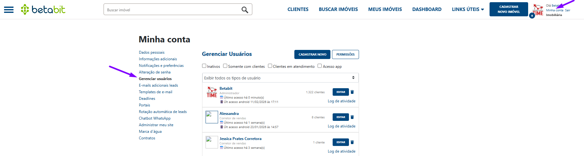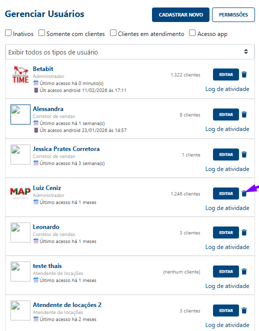 2. Selecione o usuário para exclusão Localize o corretor que deseja remover e clique no ícone da Lixeira (remover), localizado ao lado do botão "Editar".