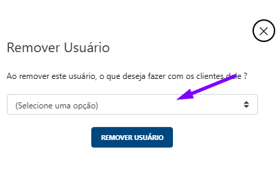 3. Defina o destino dos clientes Uma janela flutuante chamada "Remover Usuário" aparecerá com a pergunta: "Ao remover este usuário, o que deseja fazer com os clientes dele?". Você deve clicar no campo de seleção e escolher uma das opções: