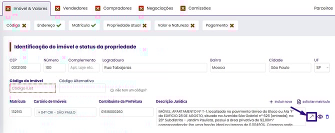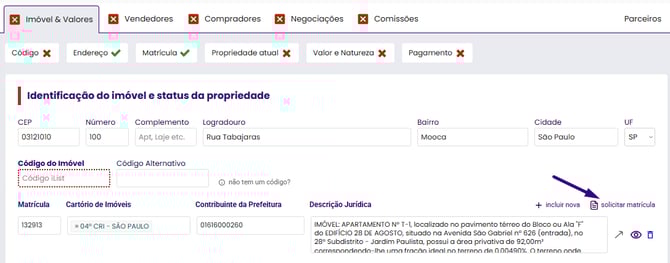 No formulário de transação, dentro da aba Imóvel & Valores, é possível solicitar a matrícula do imóvel diretamente pelo Pipeimob.
