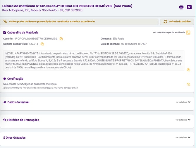 Ao clicar no olhinho 👁️, você terá acesso à análise detalhada feita pela IA, com as informações estruturadas da matrícula.