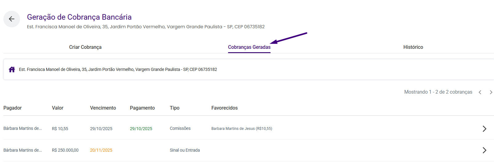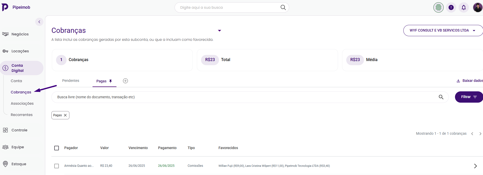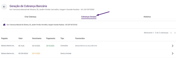 Ou pela própria transação, em Cobranças > Cobranças Geradas.