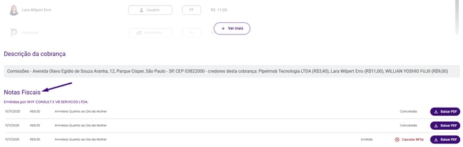 Nessa área, o sistema exibe todas as notas fiscais emitidas para aquela cobrança, com informações como data, valor e status (emitida, cancelada, etc.).