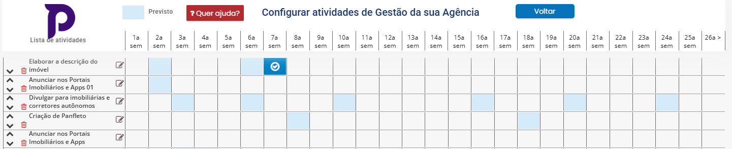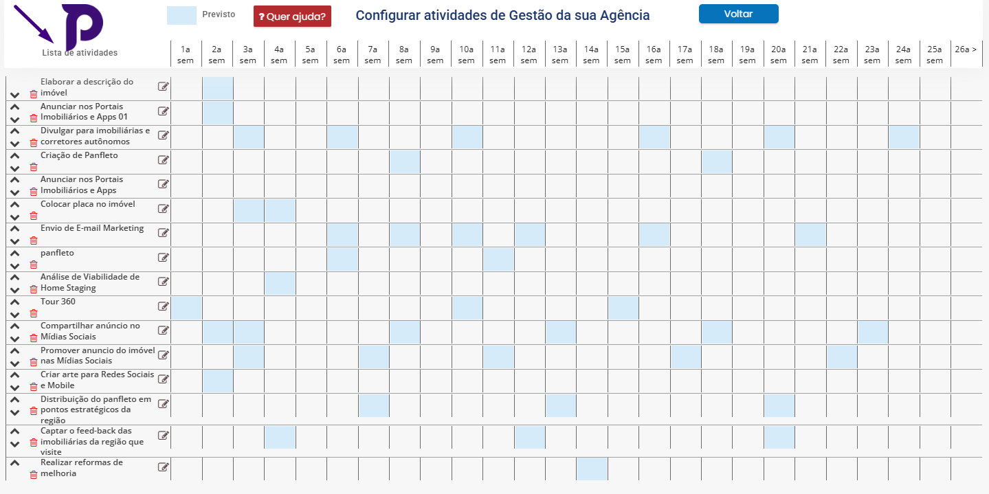 Nele, é possível marcar em qual semana é prevista ou esperada a realização de cada atividade.
