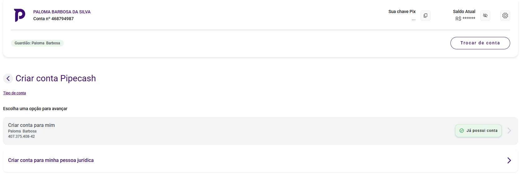- Exemplo: Se já tem uma conta PF, poderá criar apenas uma conta PJ, e vice-versa.