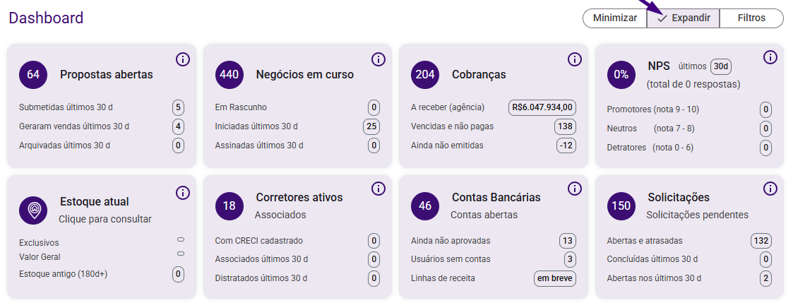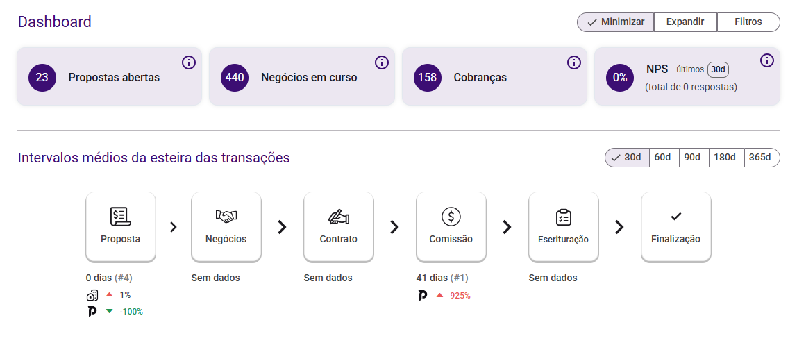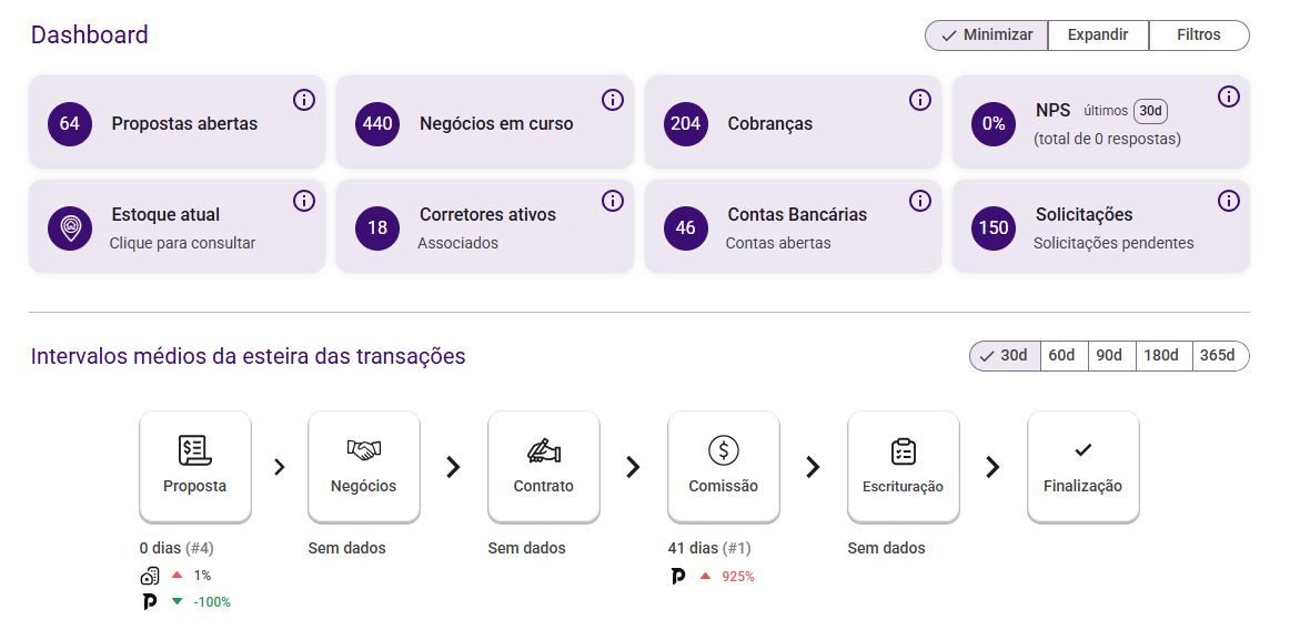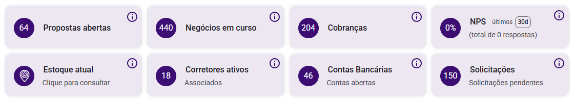 💡 Importante: Quando o acesso é feito por um perfil de corretor, alguns indicadores não são exibidos. O objetivo é garantir uma visão mais objetiva, focada apenas no que faz sentido para a atuação individual do corretor.