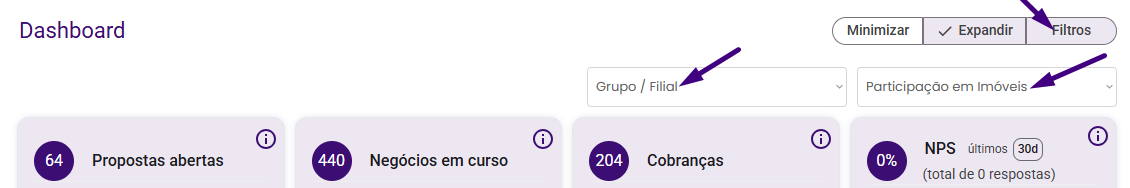 - Filtros: Permite refinar a análise dos dados exibidos no Dashboard, de acordo com a estrutura e atuação da imobiliária.