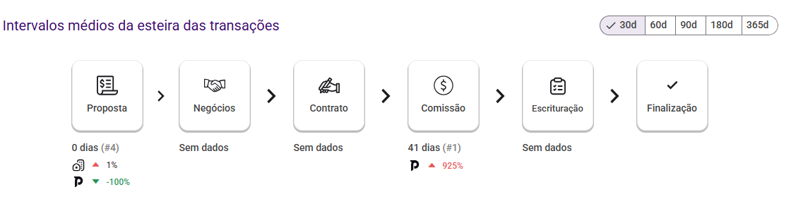 Na parte inferior do Dashboard, está a esteira de intervalos médios, que mostra o tempo médio que as transações levam para avançar entre cada etapa do processo.