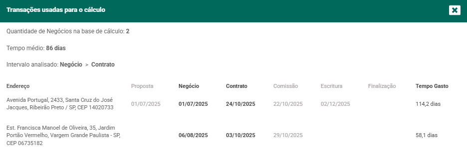 Ao clicar sobre a quantidade de dias exibida, é possível visualizar o detalhamento das transações que foram usadas como base para aquele cálculo.