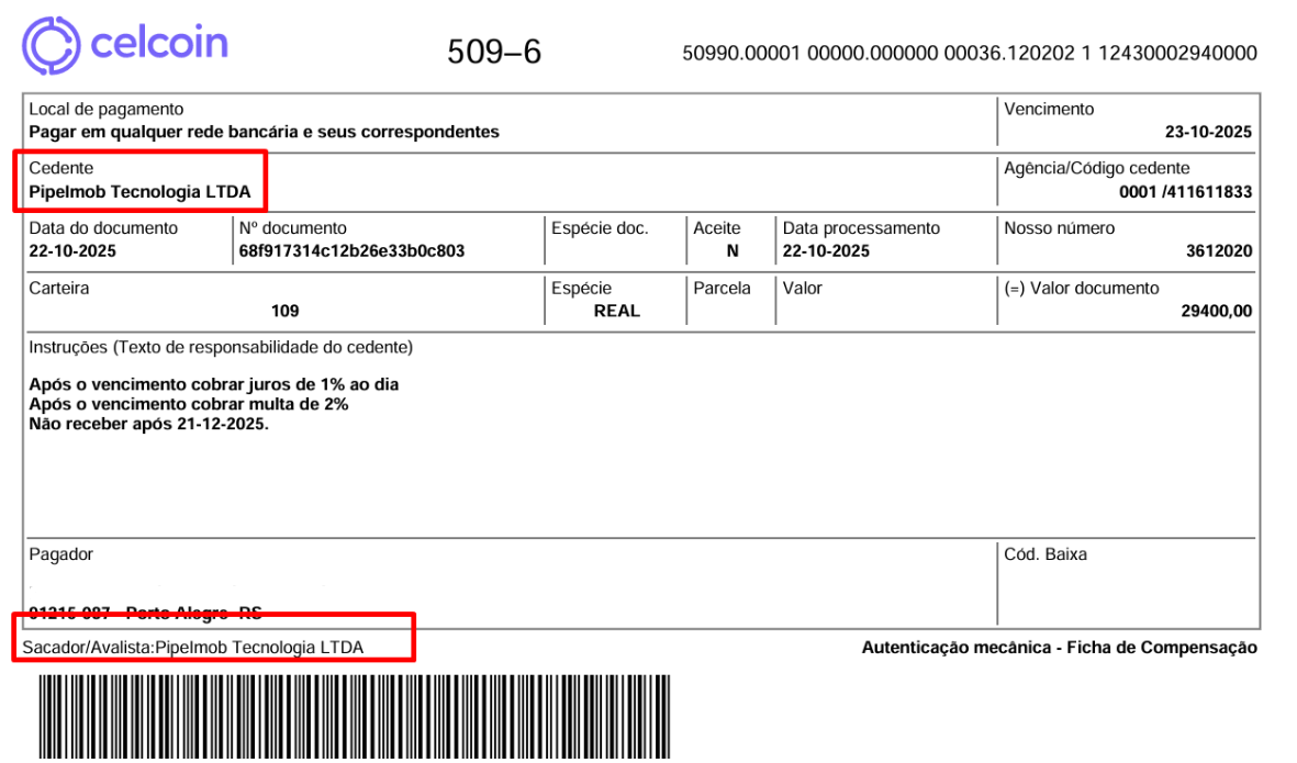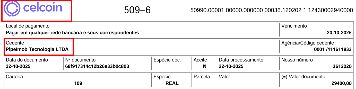 O beneficiário do pagamento sempre deve aparecer como PipeImob Tecnologia LTDA ou Celcoin Instituição de Pagamento.