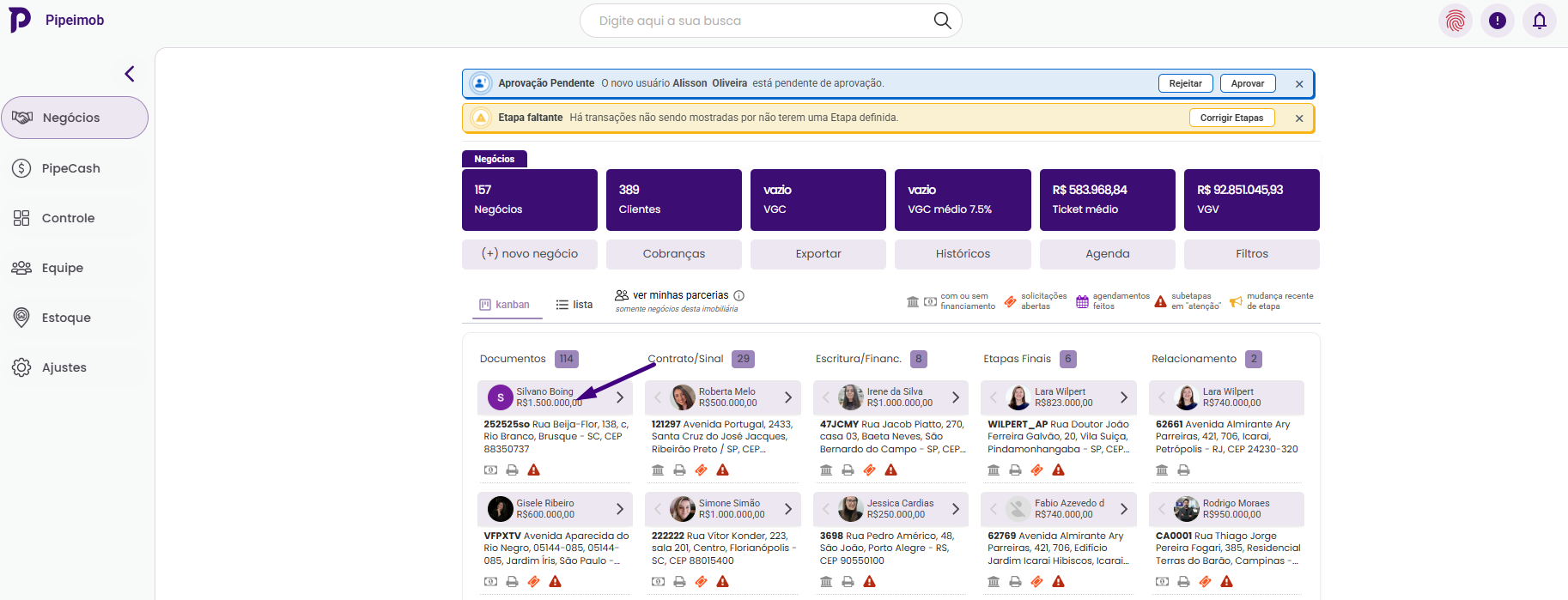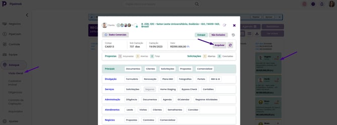 Faça isso pelo Estoque (quando deseja gerenciar diretamente) ou pela Transação (quando a unidade caiu ou foi finalizada). Sempre selecione o motivo do arquivamento e utilize o filtro Status → Arquivado para localizar ou restaurar o imóvel quando necessário.