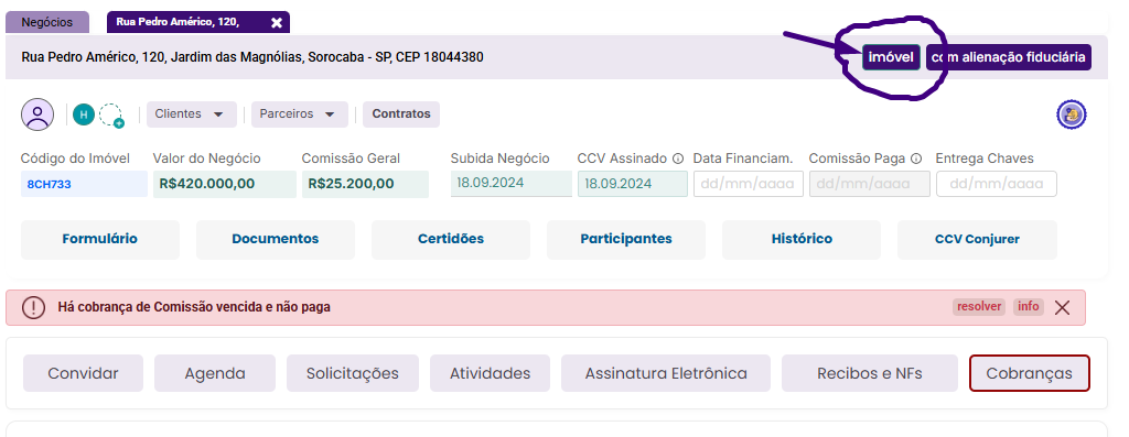 - Clique sobre o Imóvel na primeira linha clique em Imovél para ver os detalhes da unidade.