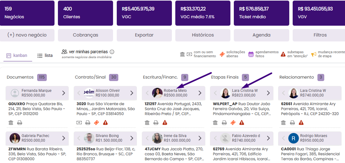 Os filtros e a nova lógica de visualização tornam a tela de Negócios um espelho fiel da estrutura organizacional da imobiliária.