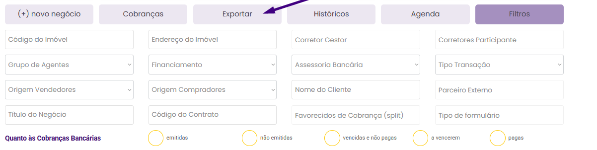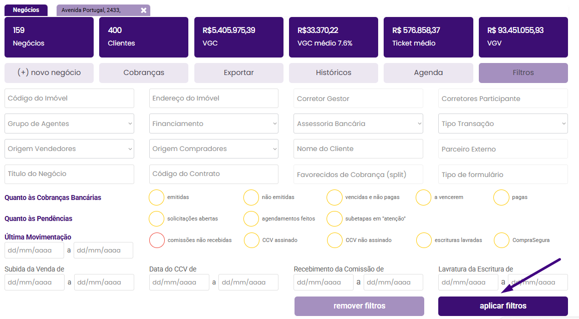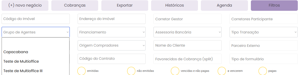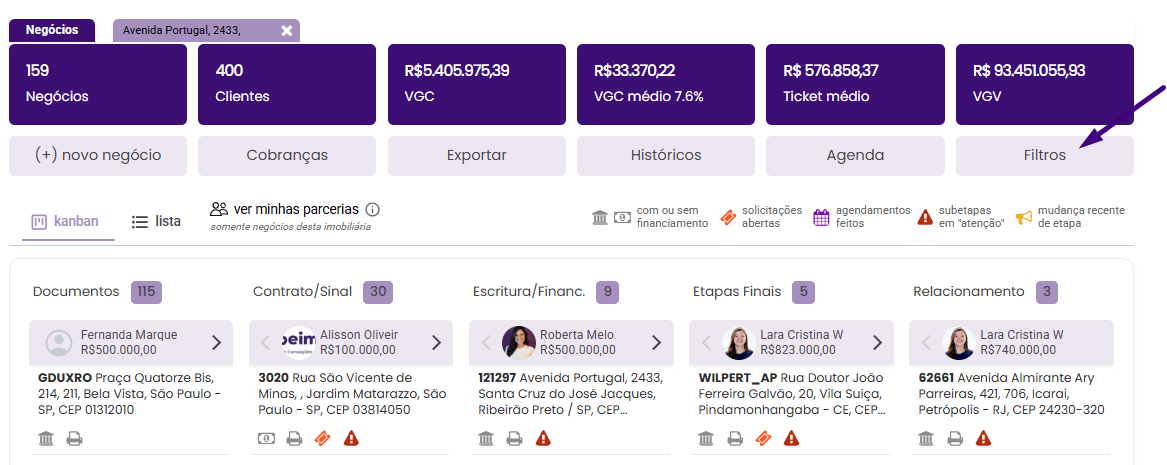 Como usar os filtros na tela de Negócios