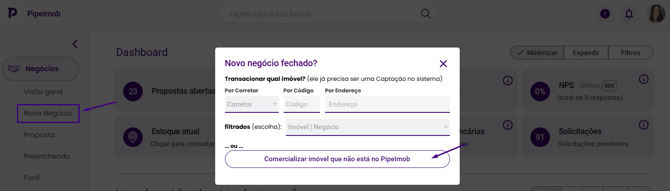 - Escolha a opção "Comercializar imóvel que não está no Pipeimob";