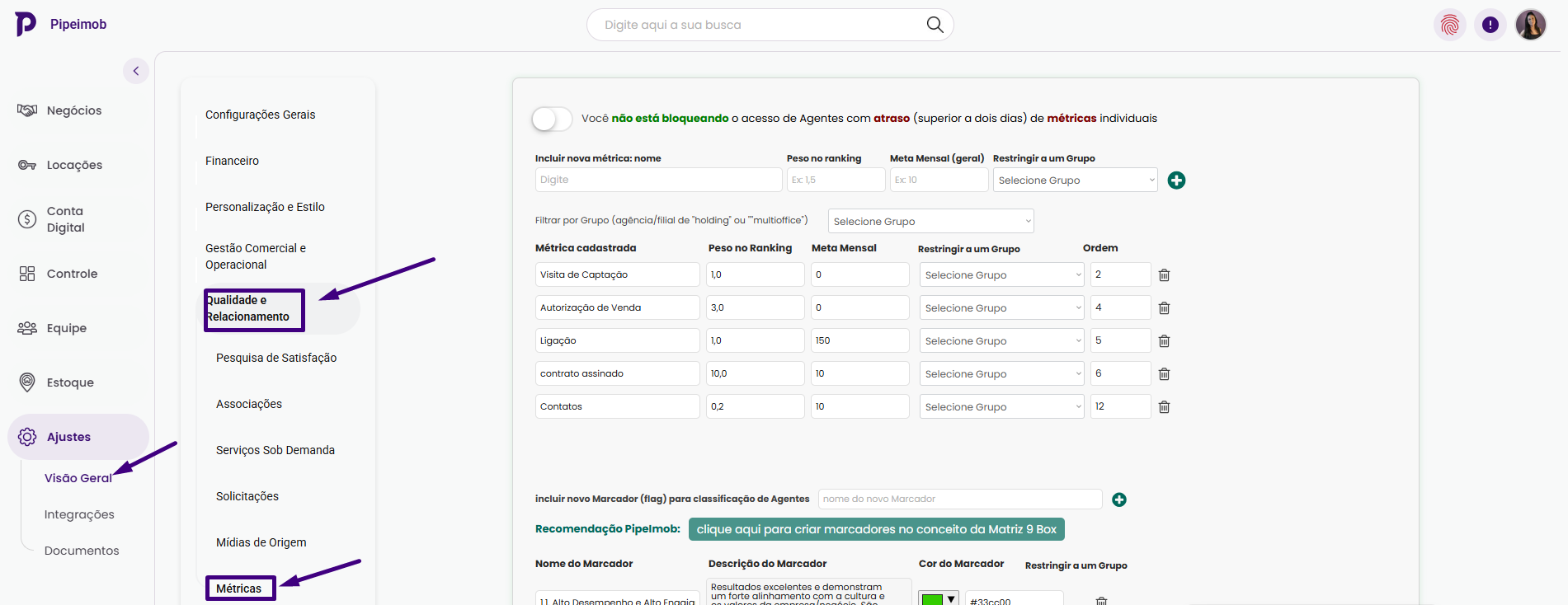 A gestão de métricas no Pipeimob permite que a imobiliária acompanhe a produtividade dos corretores, organize rankings e mantenha a disciplina no preenchimento de indicadores definidos pela gestão. Neste artigo, você confere como configurar as métricas e controlar a obrigatoriedade de preenchimento.