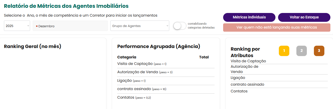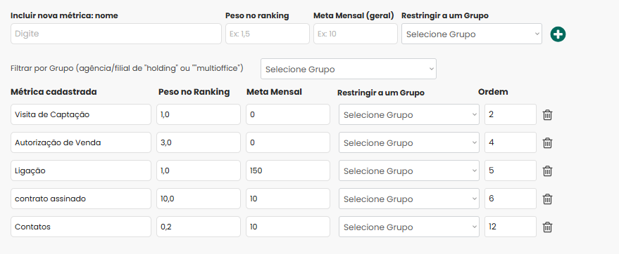 Configure e acompanhe o preenchimento de métricas de desempenho dos corretores.