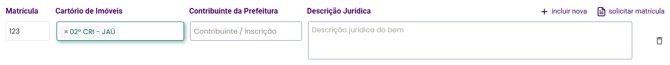 💡 Dica importante: Após preencher a matrícula e o cartório, é possível solicitar a matrícula via Pipeimob com análise por inteligência artificial. Quando a matrícula é solicitada dessa forma, o sistema não apenas recupera o documento oficial, como também preenche automaticamente a descrição jurídica do imóvel no formulário. Saiba mais: Como solicitar a matrícula do imóvel pelo Pipeimob