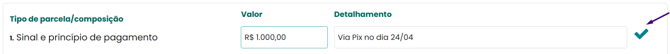 ✅ Clique no ícone de confirmação para validar cada linha após preencher valor e descrição.
