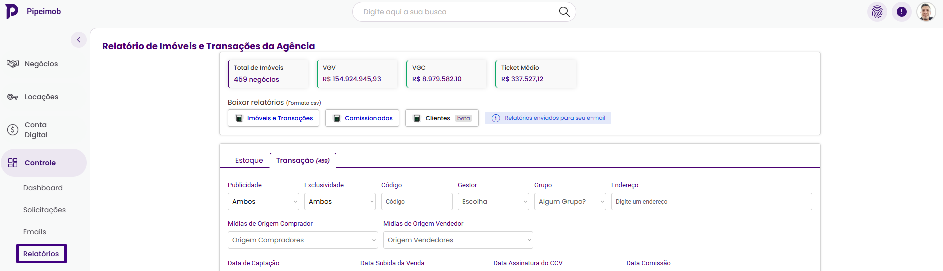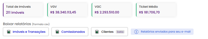 Dentro de Controle > Relatórios, você tem acesso a todas as informações consolidadas de estoque e transações realizadas pela sua imobiliária.