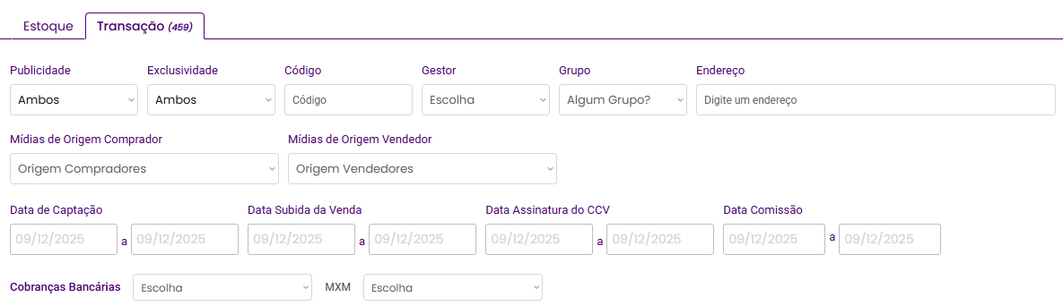 Na aba Transação, você pode aplicar diversos filtros para localizar qualquer negociação realizada.