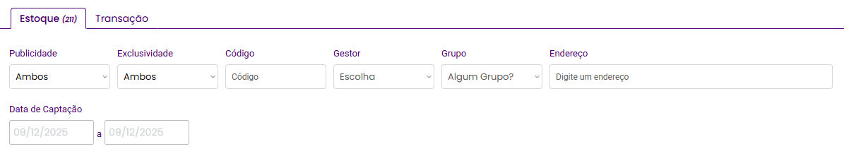 Na aba Estoque, também é possível filtrar imóveis por fase e características específicas.