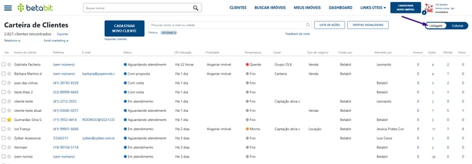 Como funciona: Exibe os clientes em linhas, permitindo visualizar mais informações de uma só vez, como e-mail, telefone, canal de origem e o nome do atendente responsável.