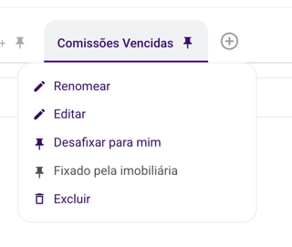 Usuários com perfil de gestor da imobiliária podem criar uma visualização e fixá-la para toda a imobiliária. Quando isso acontece, essa aba passa a aparecer automaticamente para todos os usuários da empresa naquela tela.